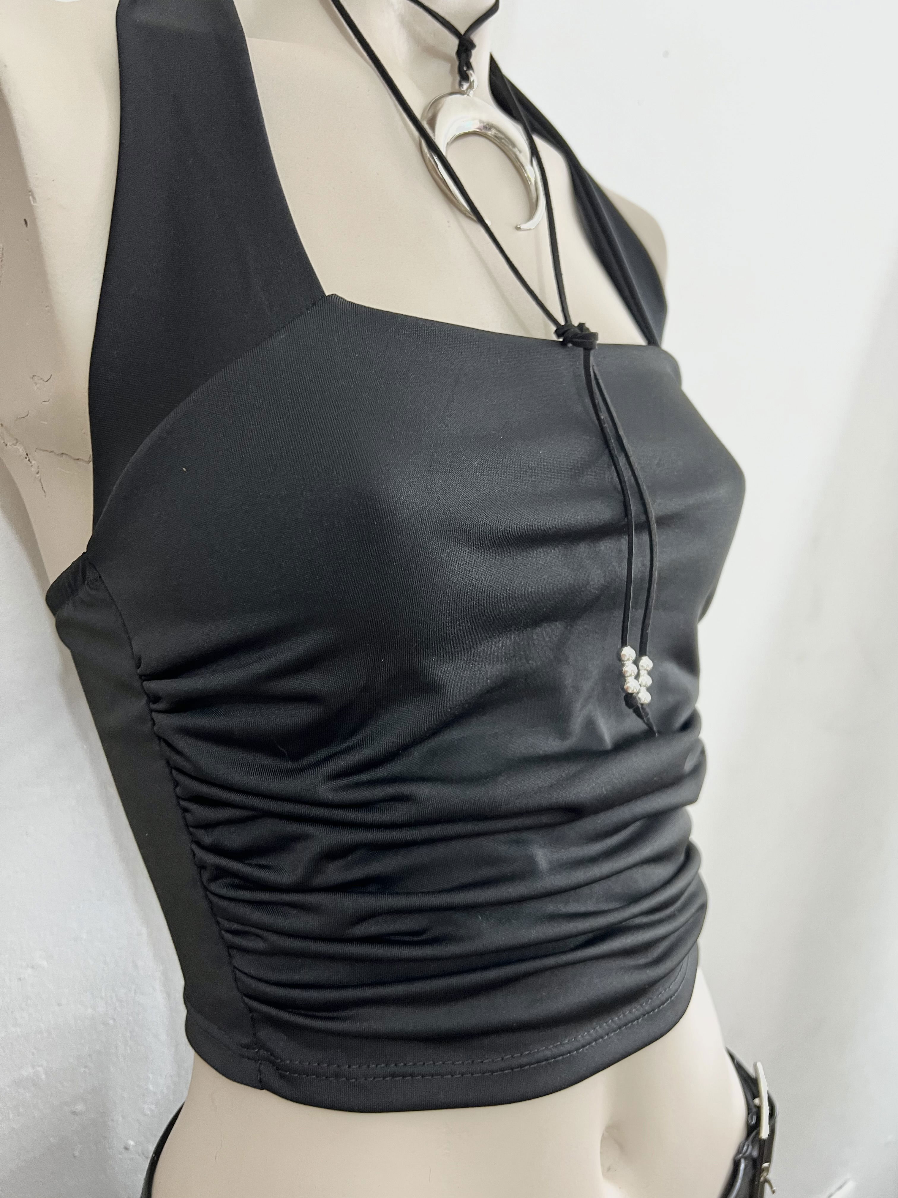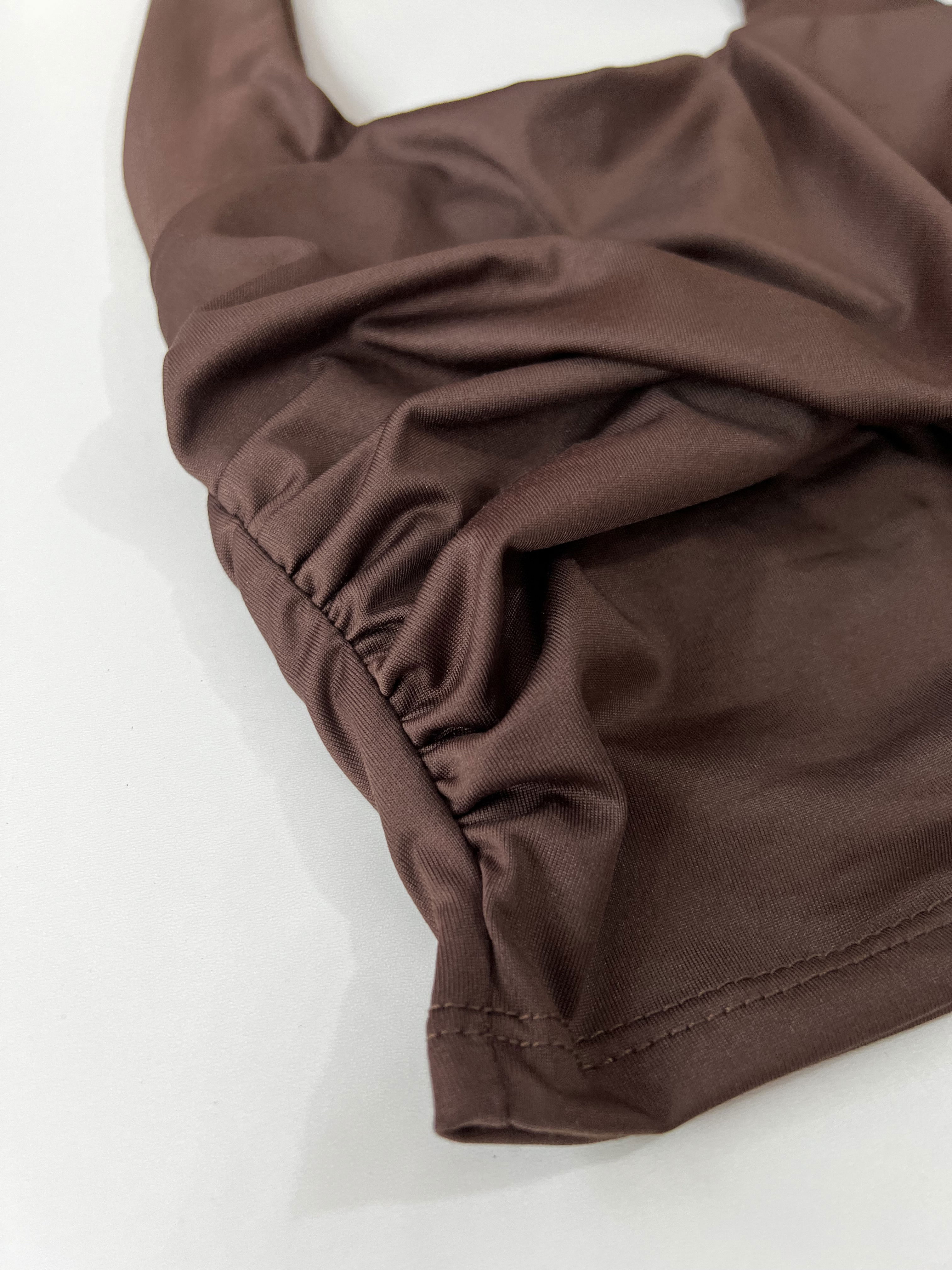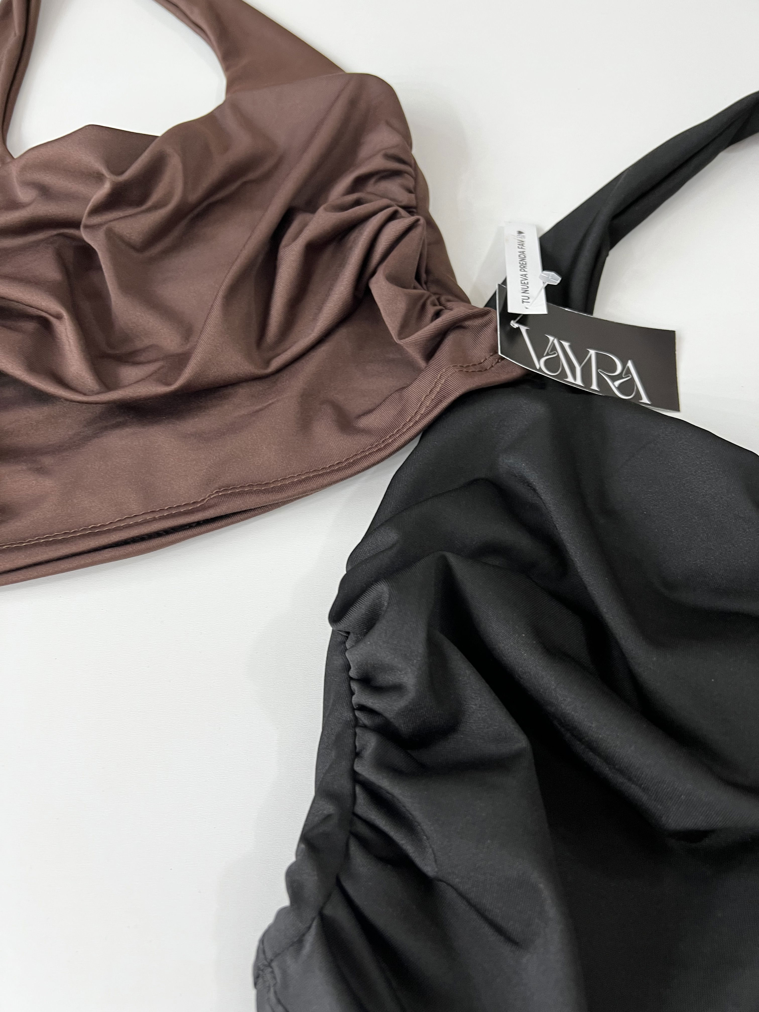 modal con efecto brillante, escote cuadrado y frunces laterales. Con espalda descubierta.