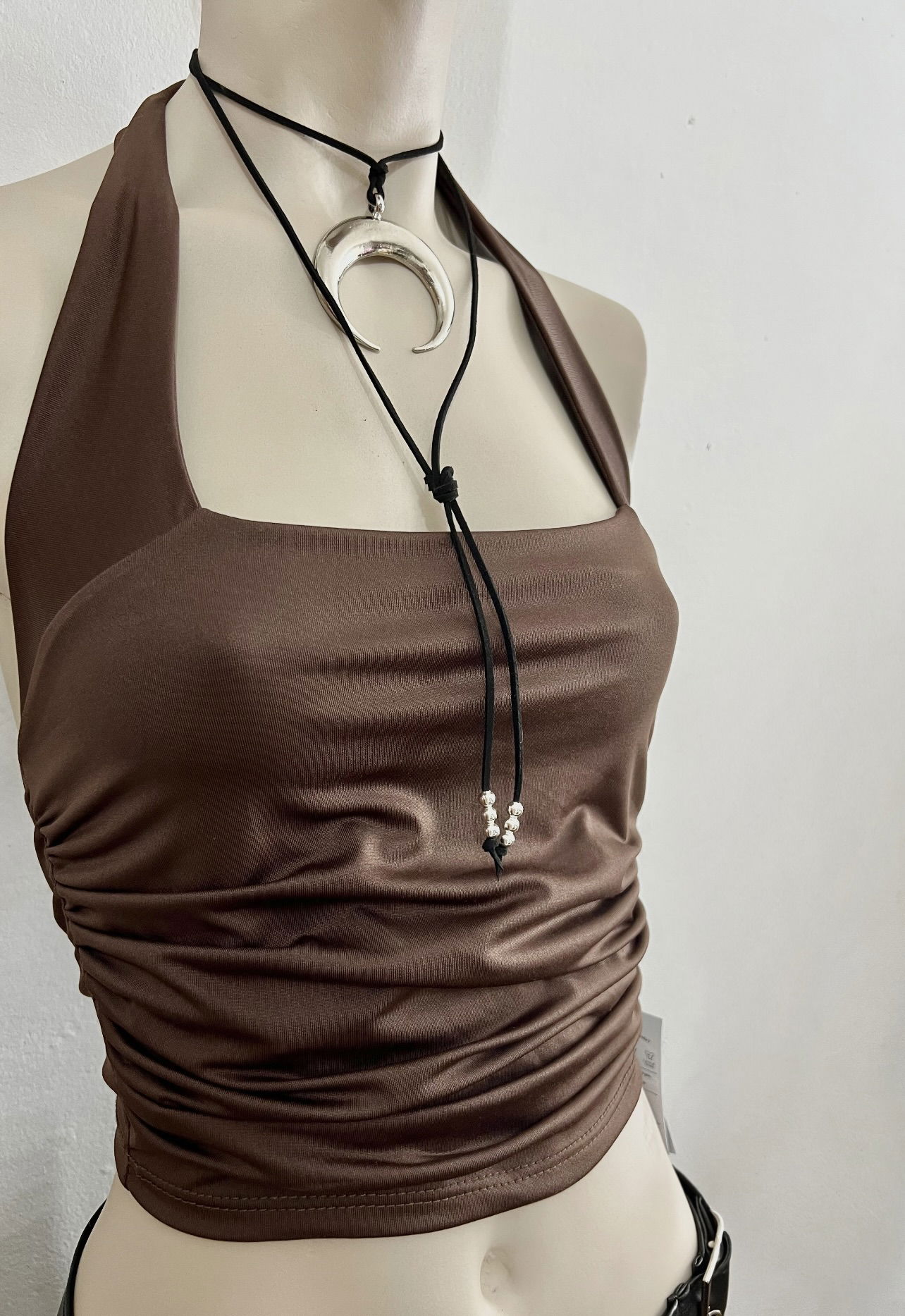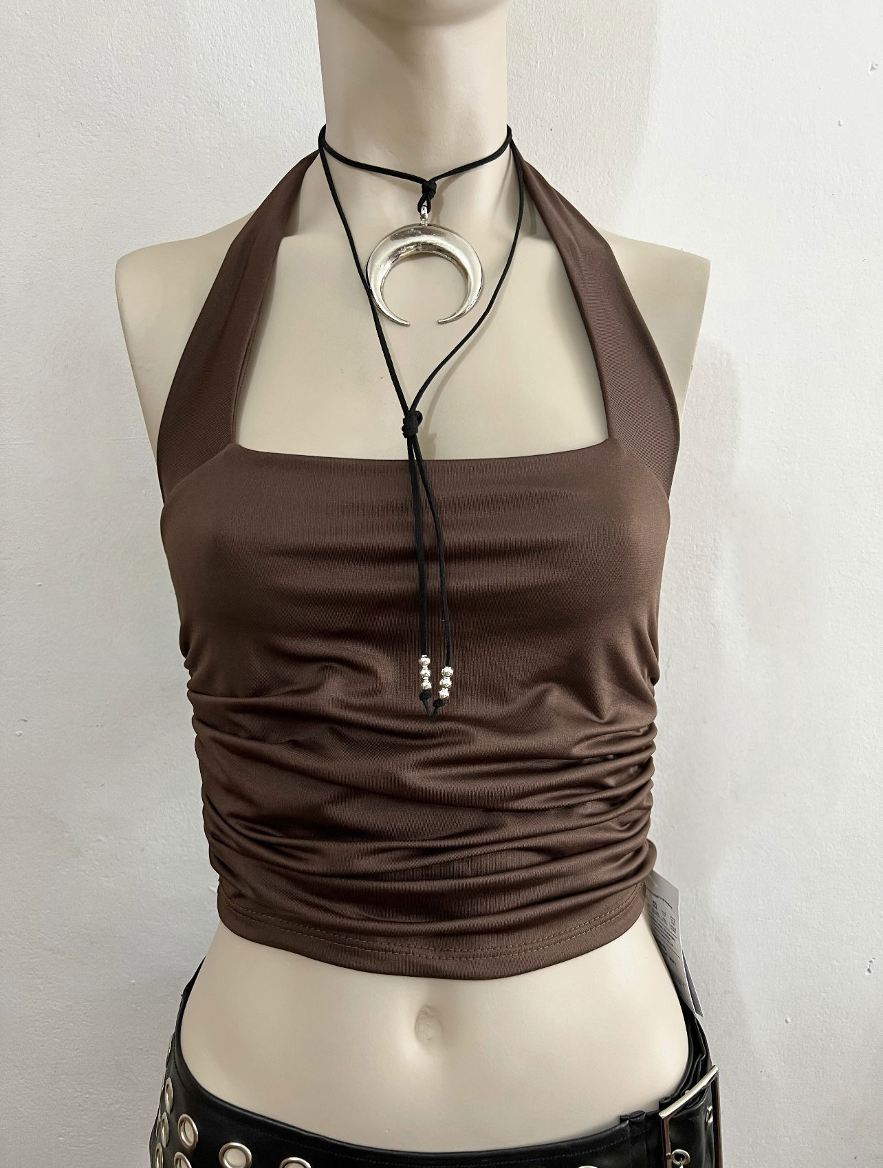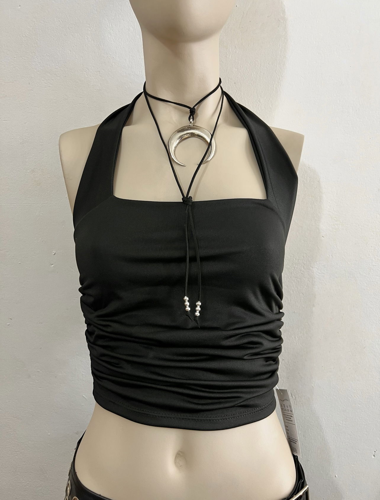 modal con efecto brillante, escote cuadrado y frunces laterales. Con espalda descubierta.