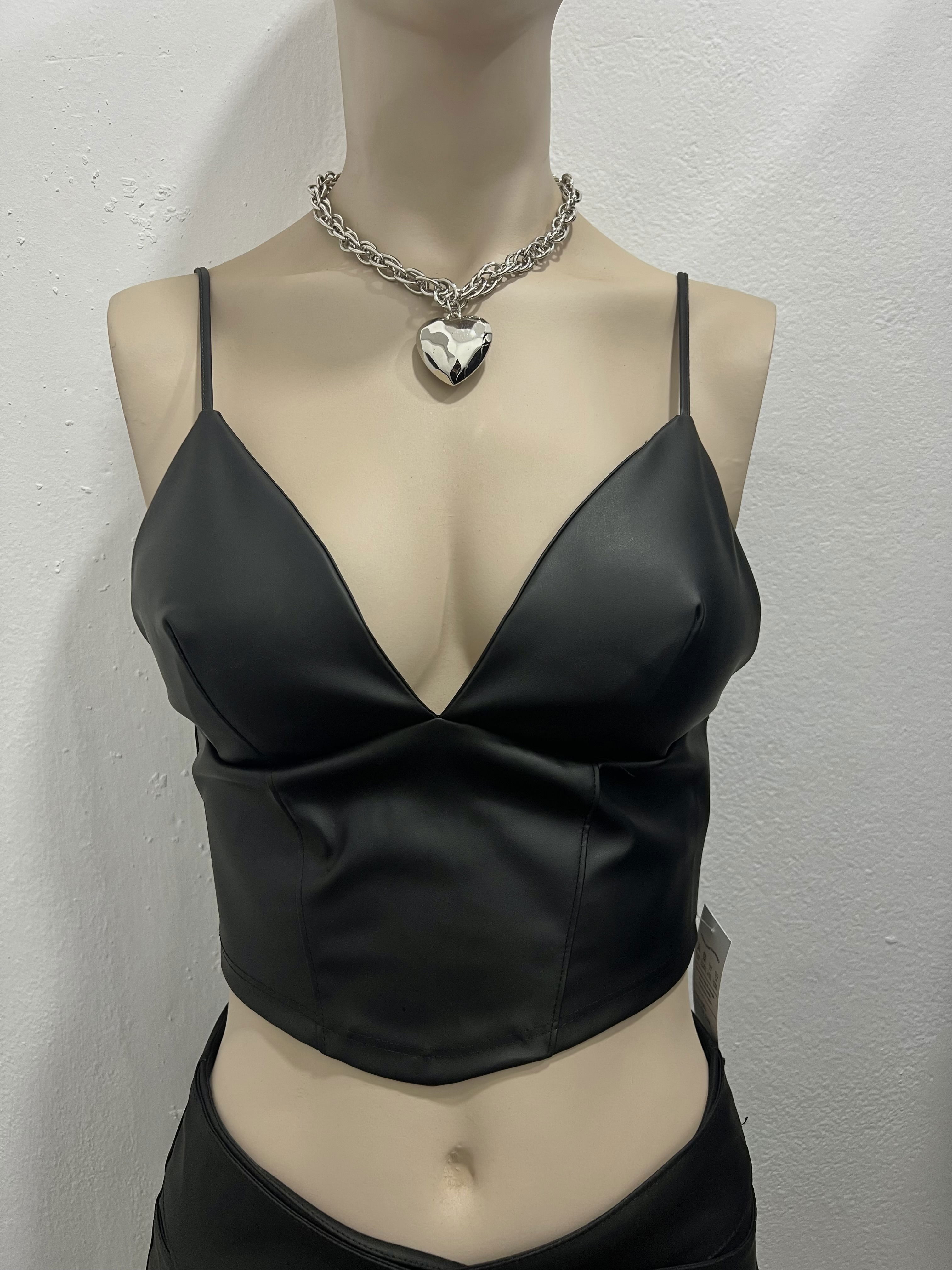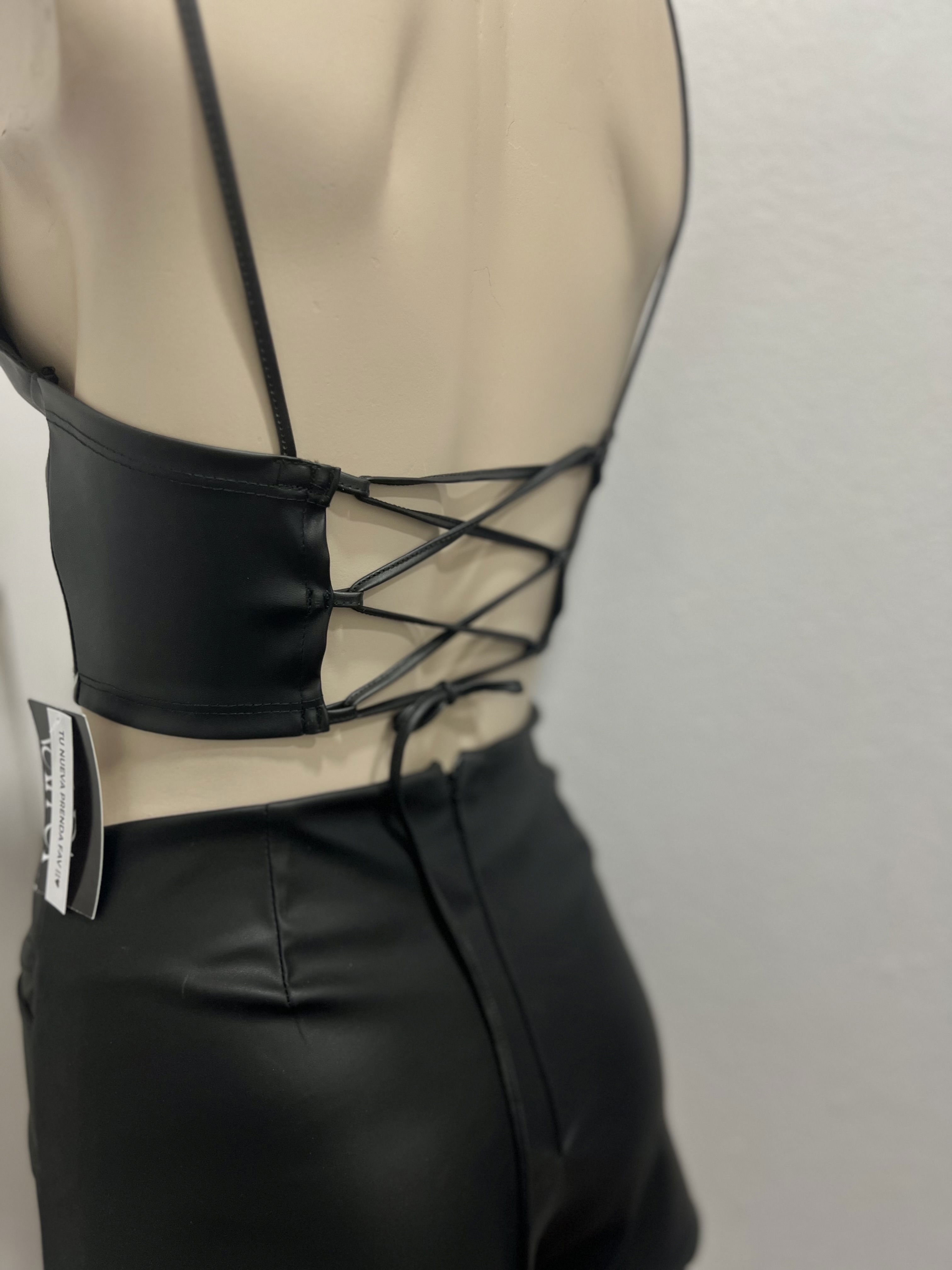 Top de cuerina negro con tazas y breteles finos regulables. Diseño escote en “V” y espalda descubierta con tiras cruzadas ajustables para atar. Ideal para un look nocturno con actitud.