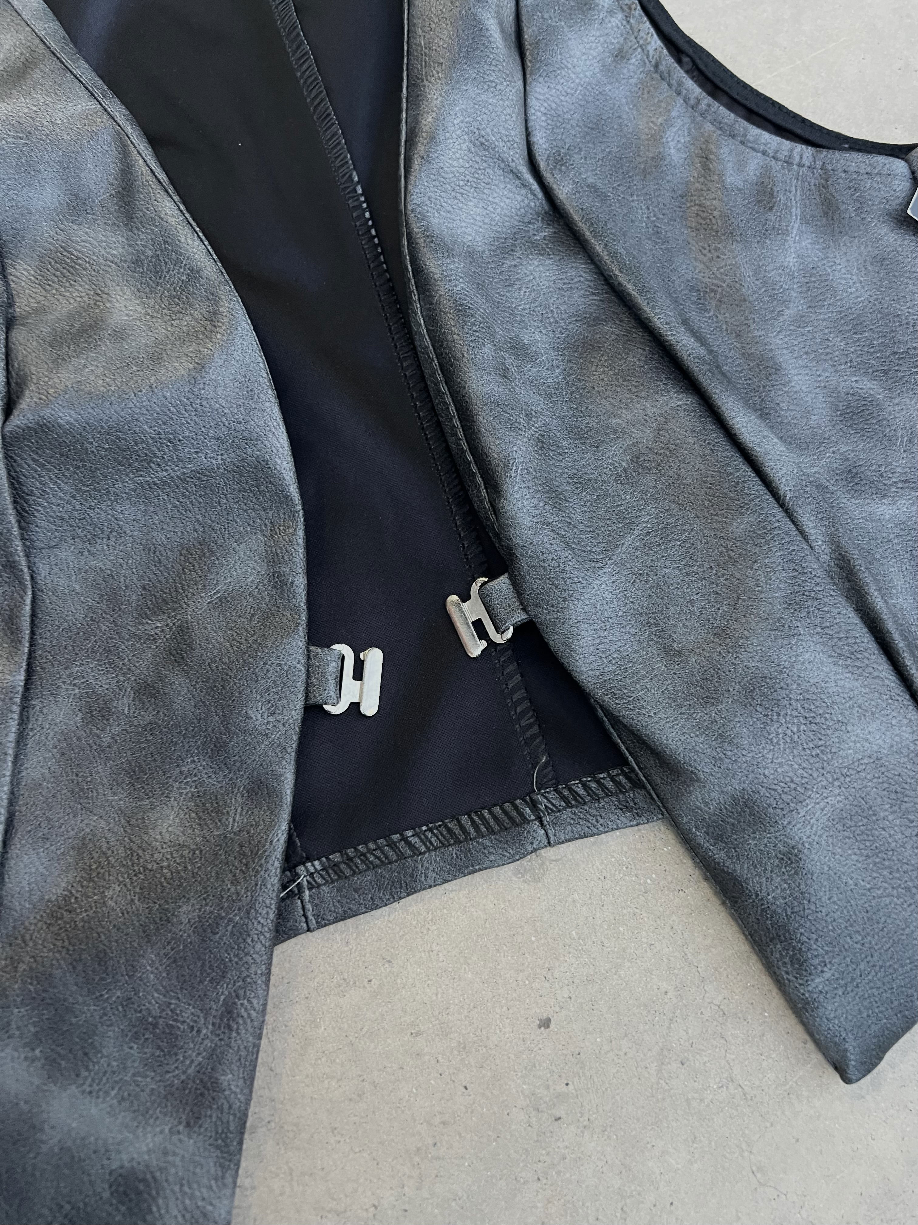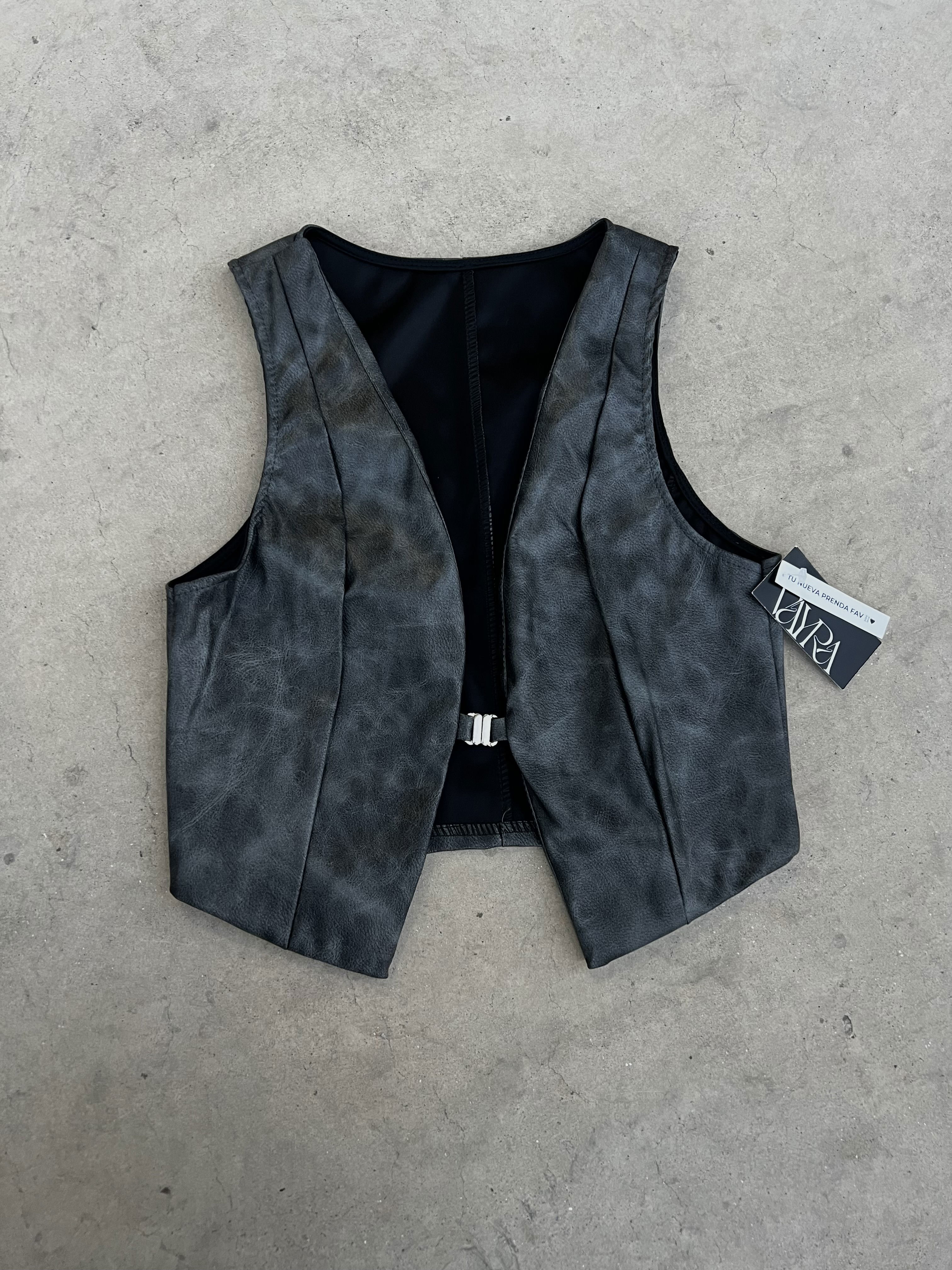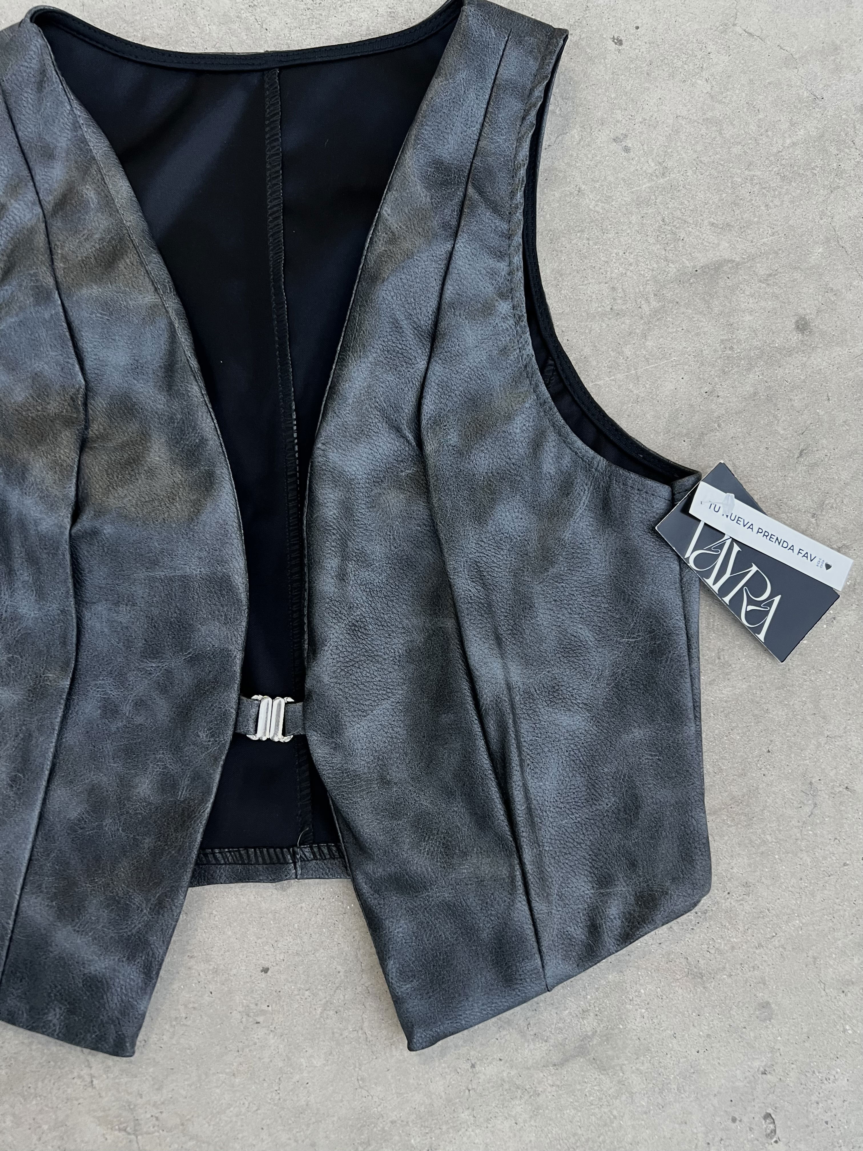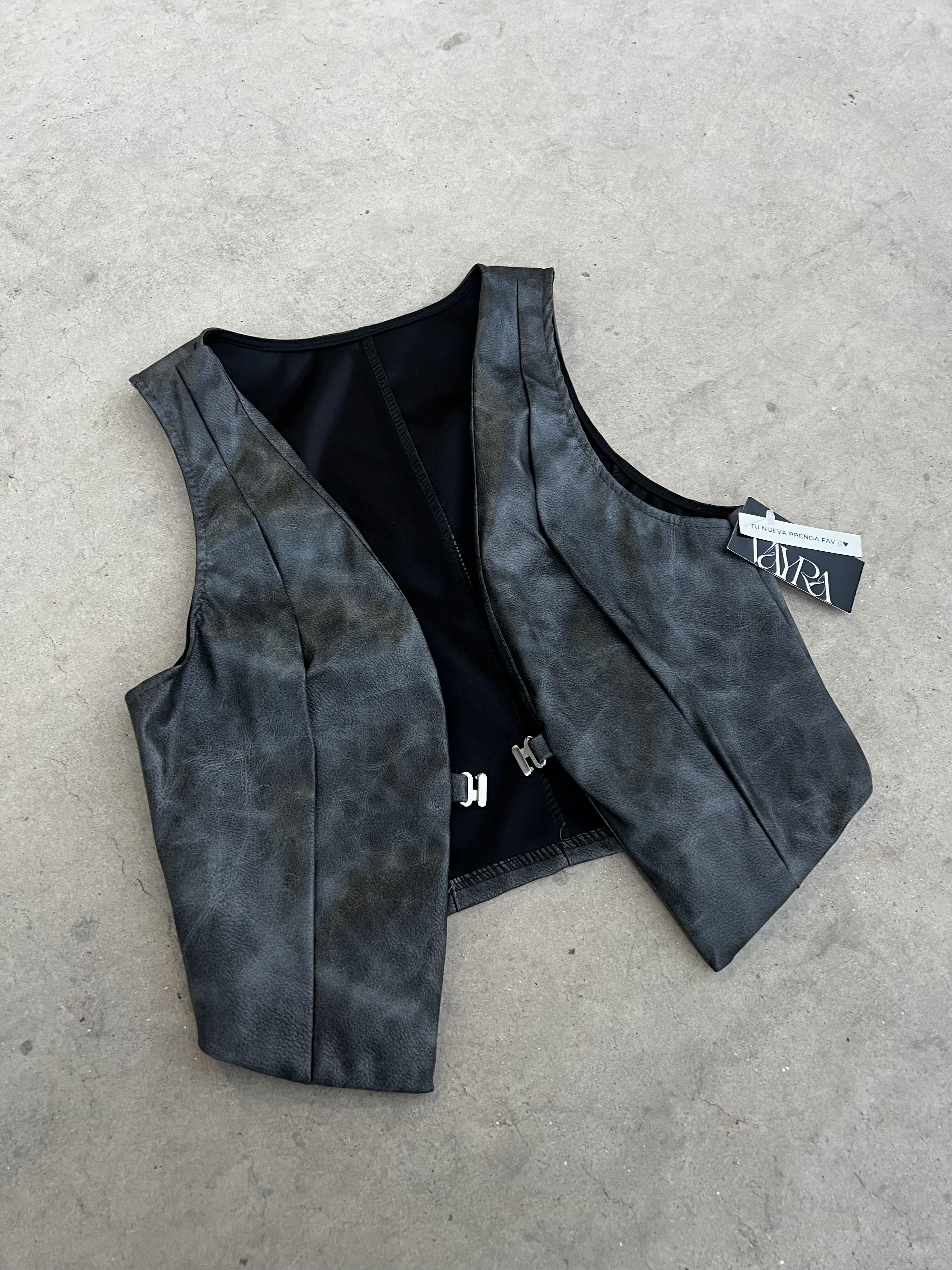 Chaleco sin mangas de cuerina con dise帽o oxi, que se desprende por delante. Tela r铆gida con un acabado gris gastado que aporta un estilo urbano y moderno. Ideal para combinar con prendas b谩sicas o para un look m谩s atrevido.