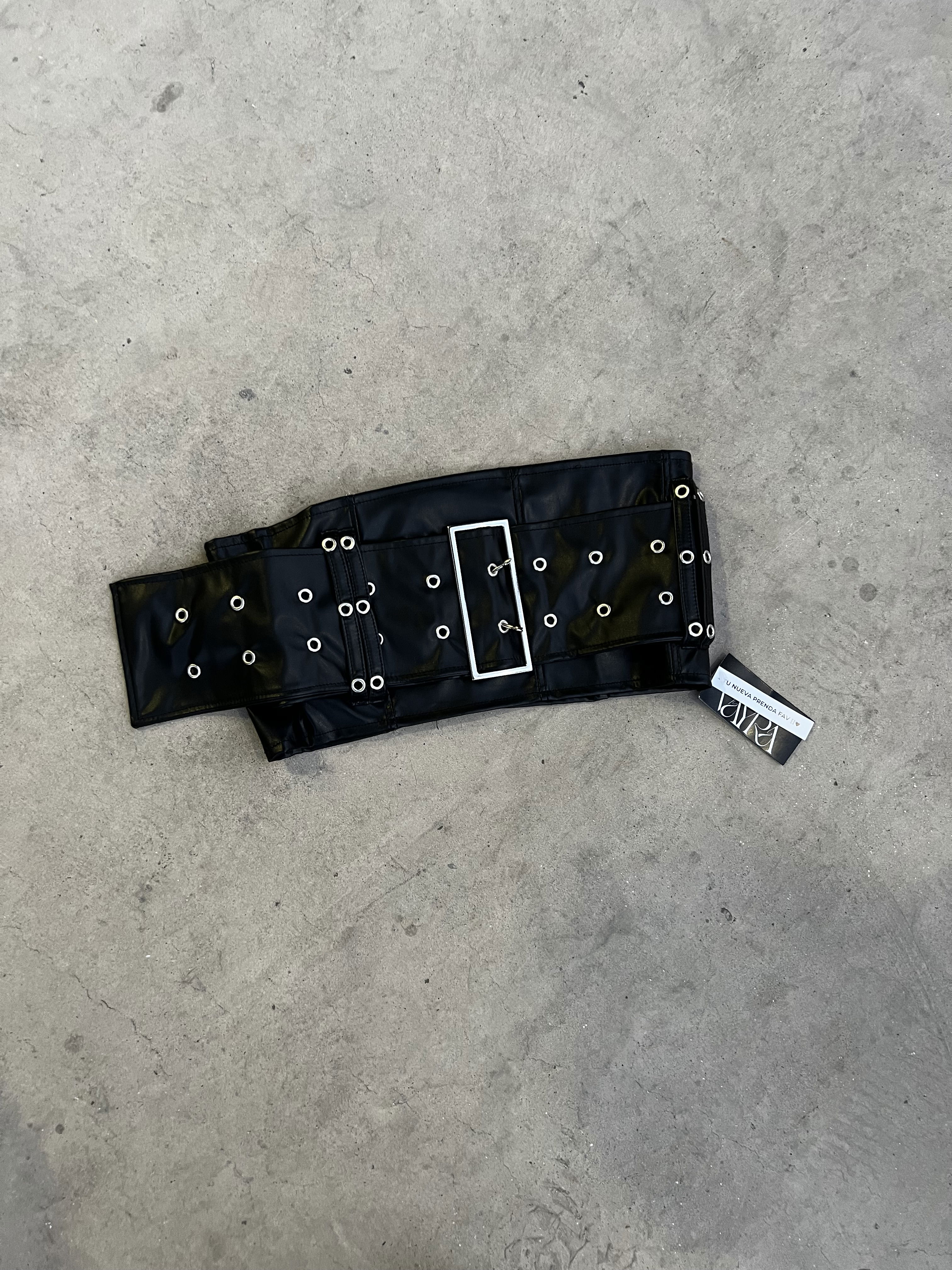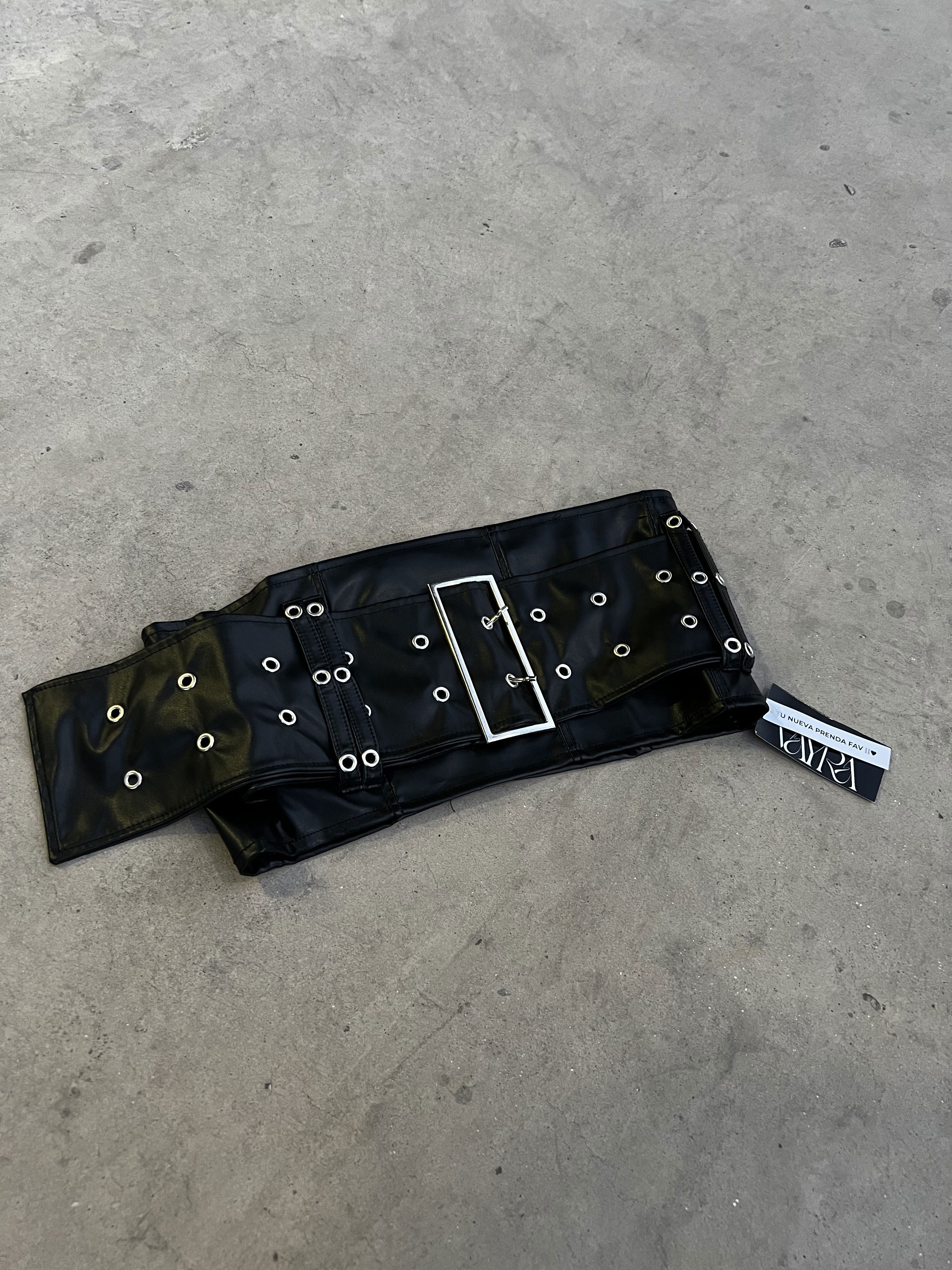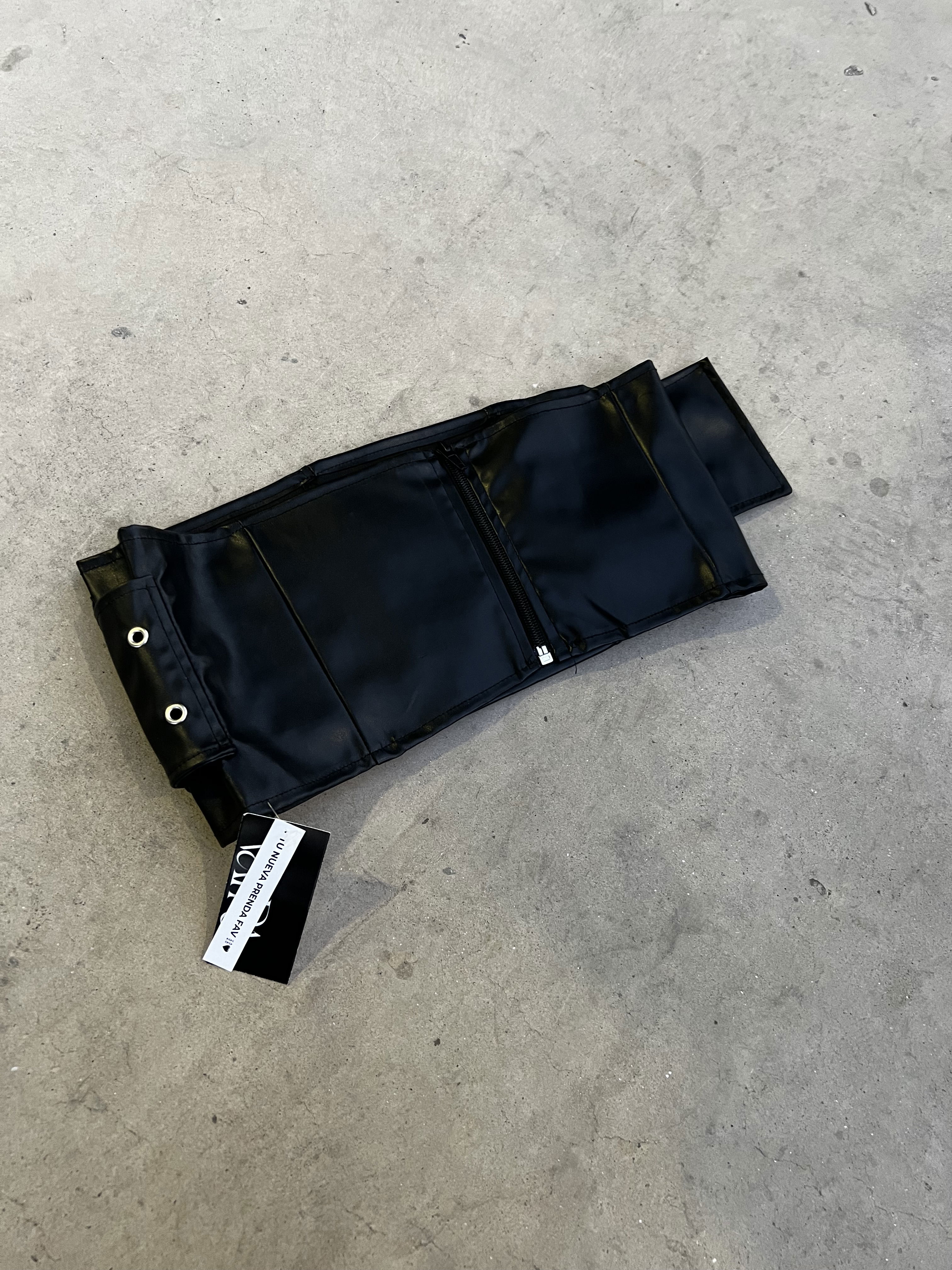 Top strapless confeccionado en cuerina negra, con hebilla ajustable en el frente y cierre en la parte trasera. Diseño entallado que realza la silueta, ideal para un look nocturno audaz y sofisticado.