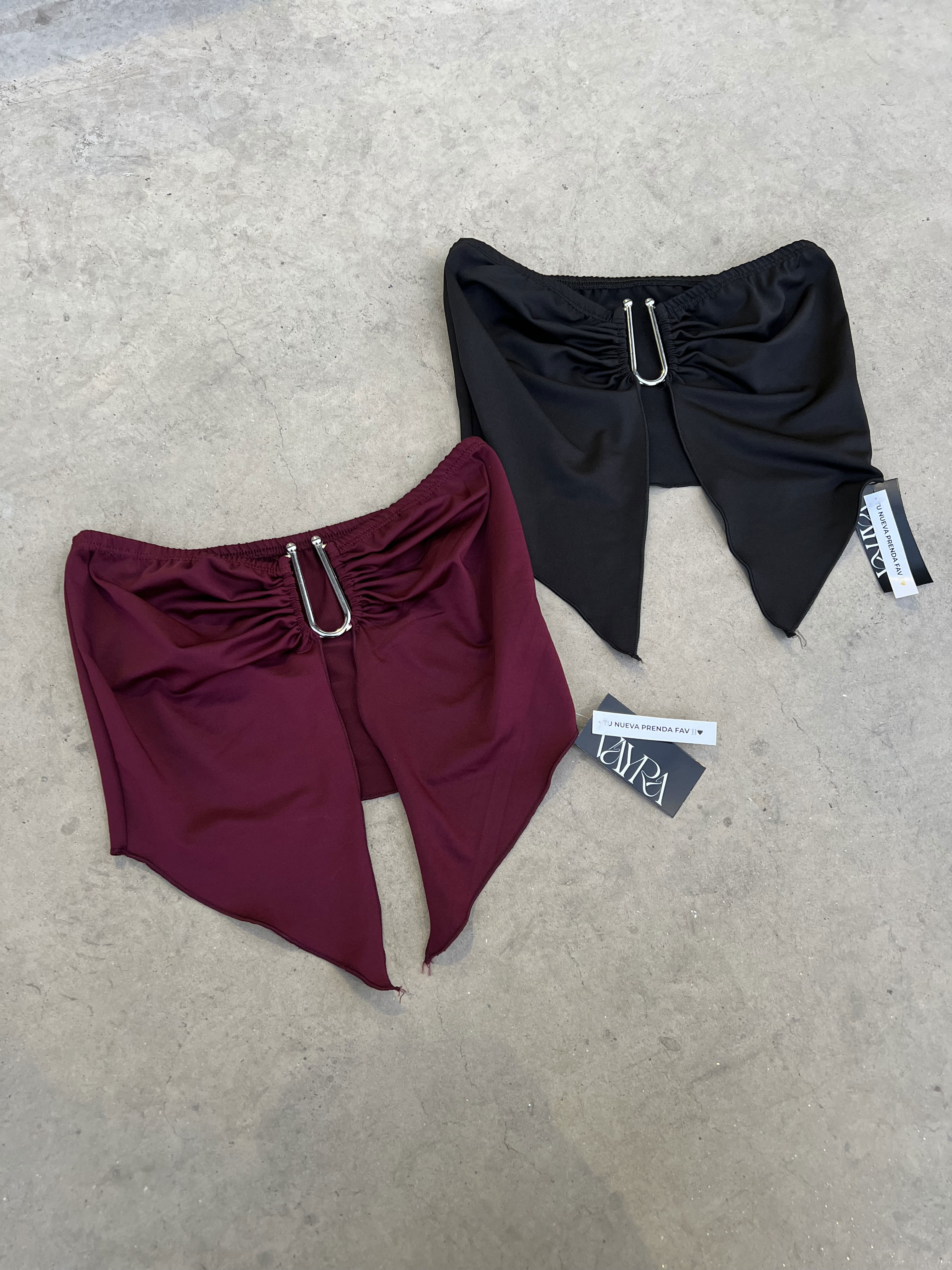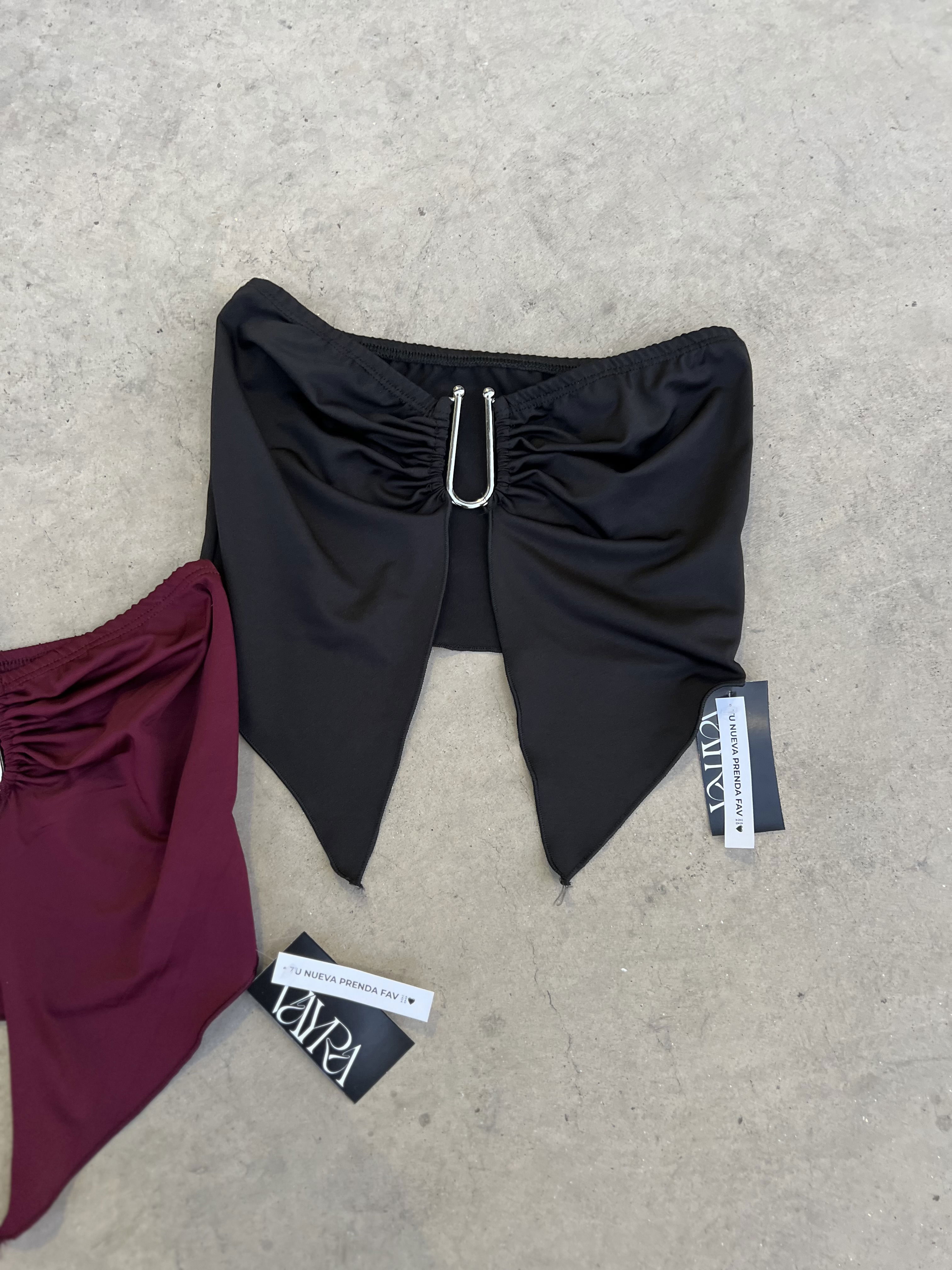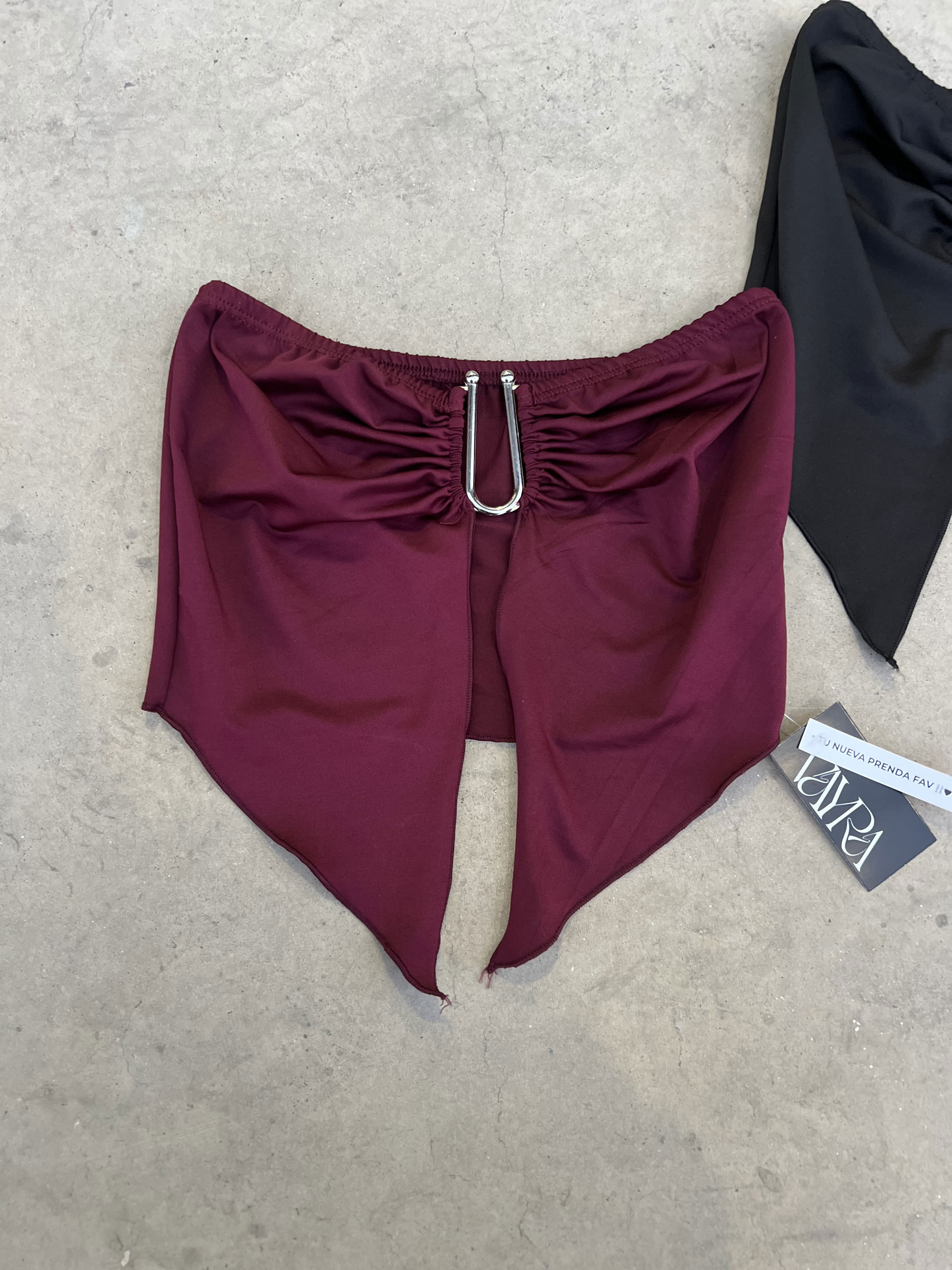 Top strapless confeccionado en tela lycra elastizada, con diseño de escote en corazón y detalle de hebilla metálica en el centro. Disponible en color negro y bordo
