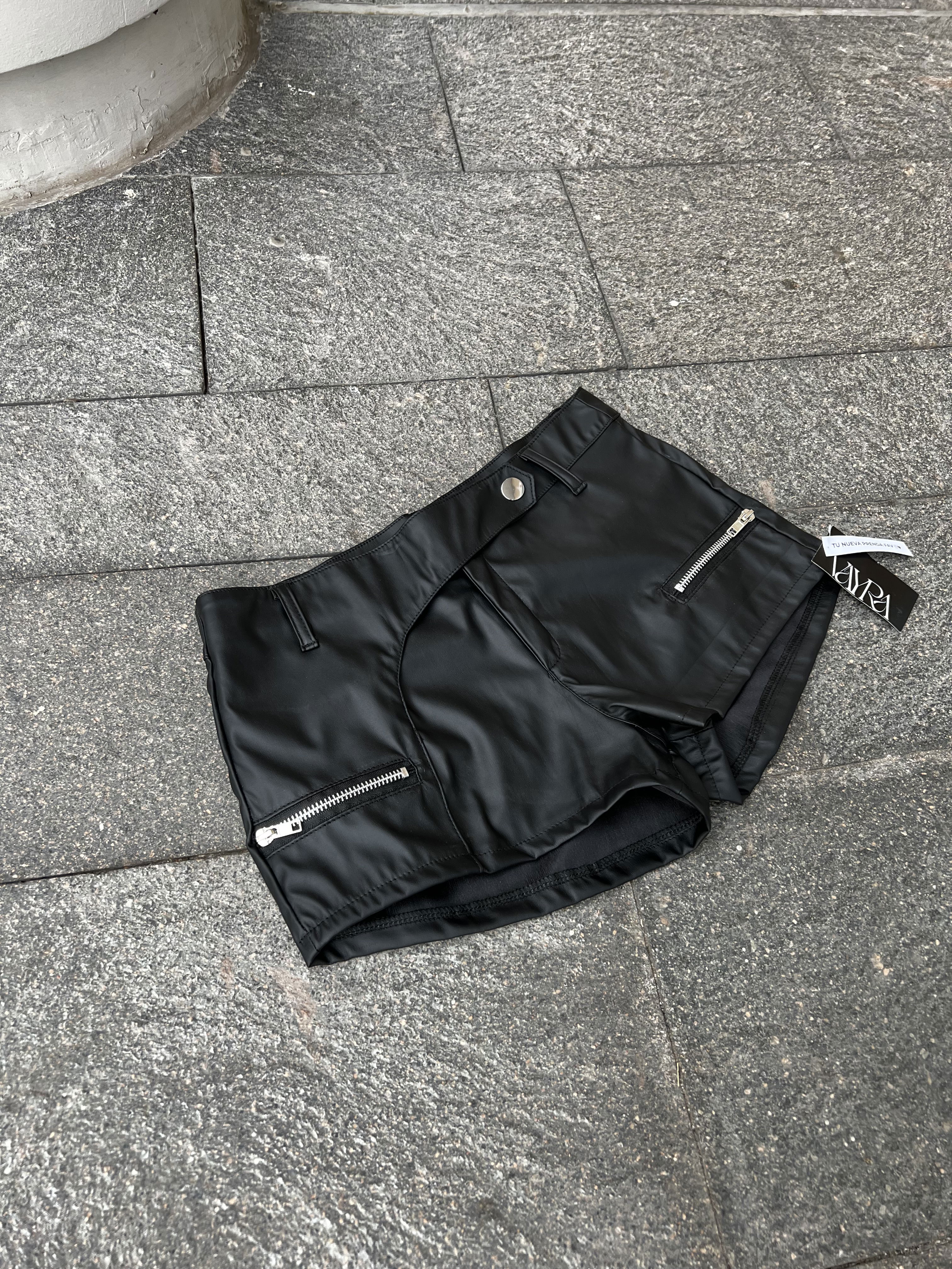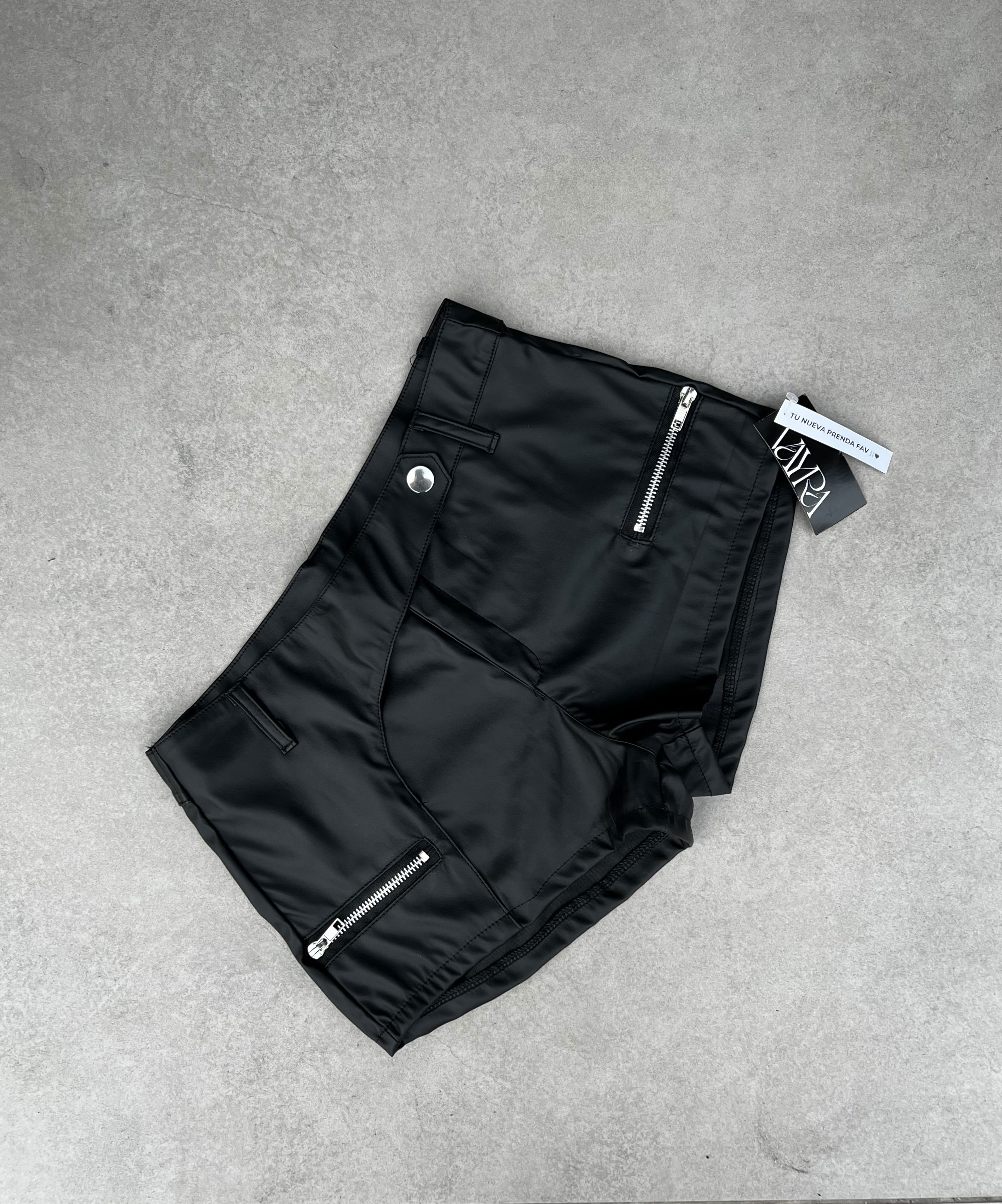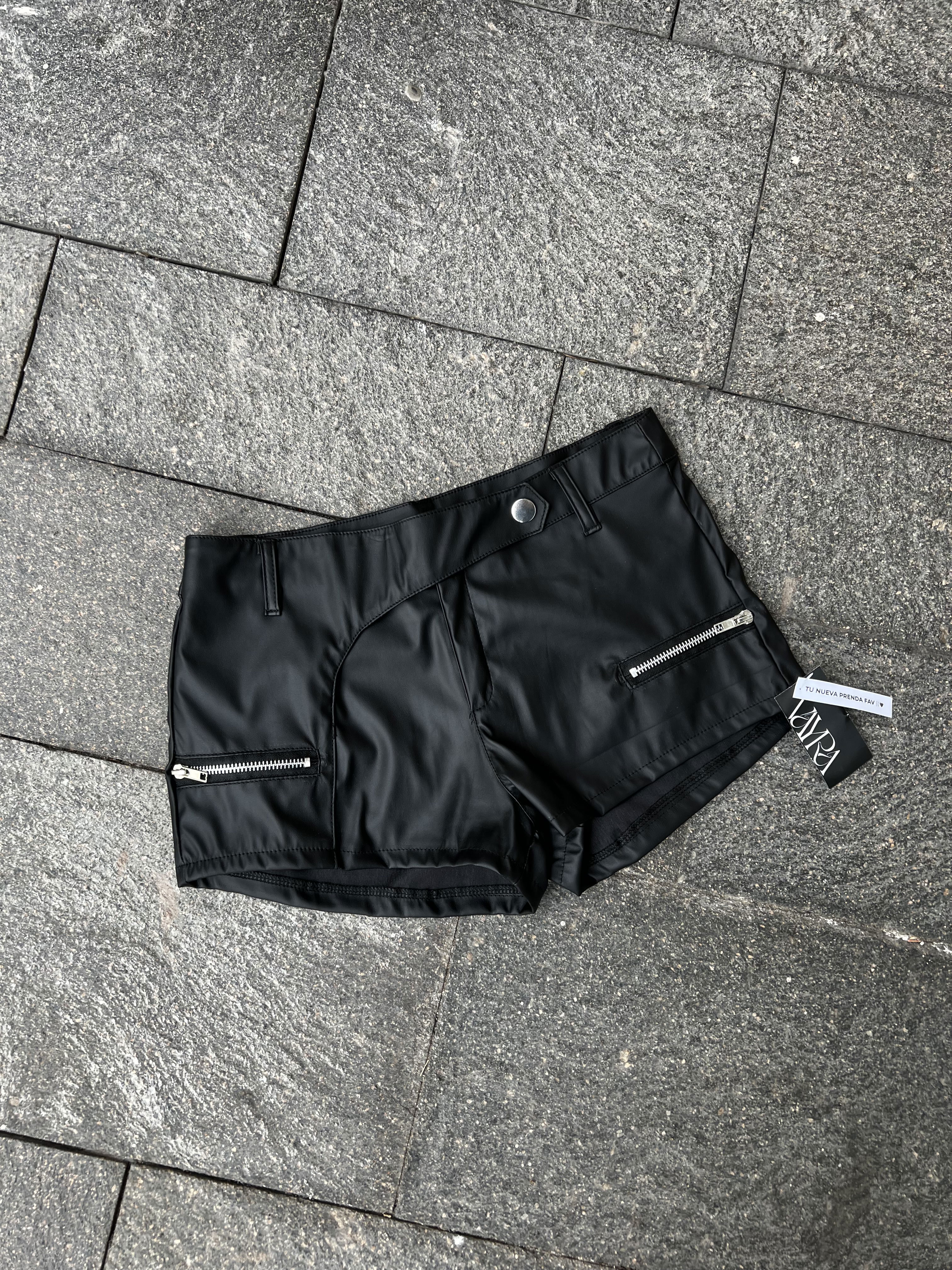 Short blakk tiro medio engomado negro, Diseño con corte irregular hacia el boton y cirres lateralares no funcionales.
