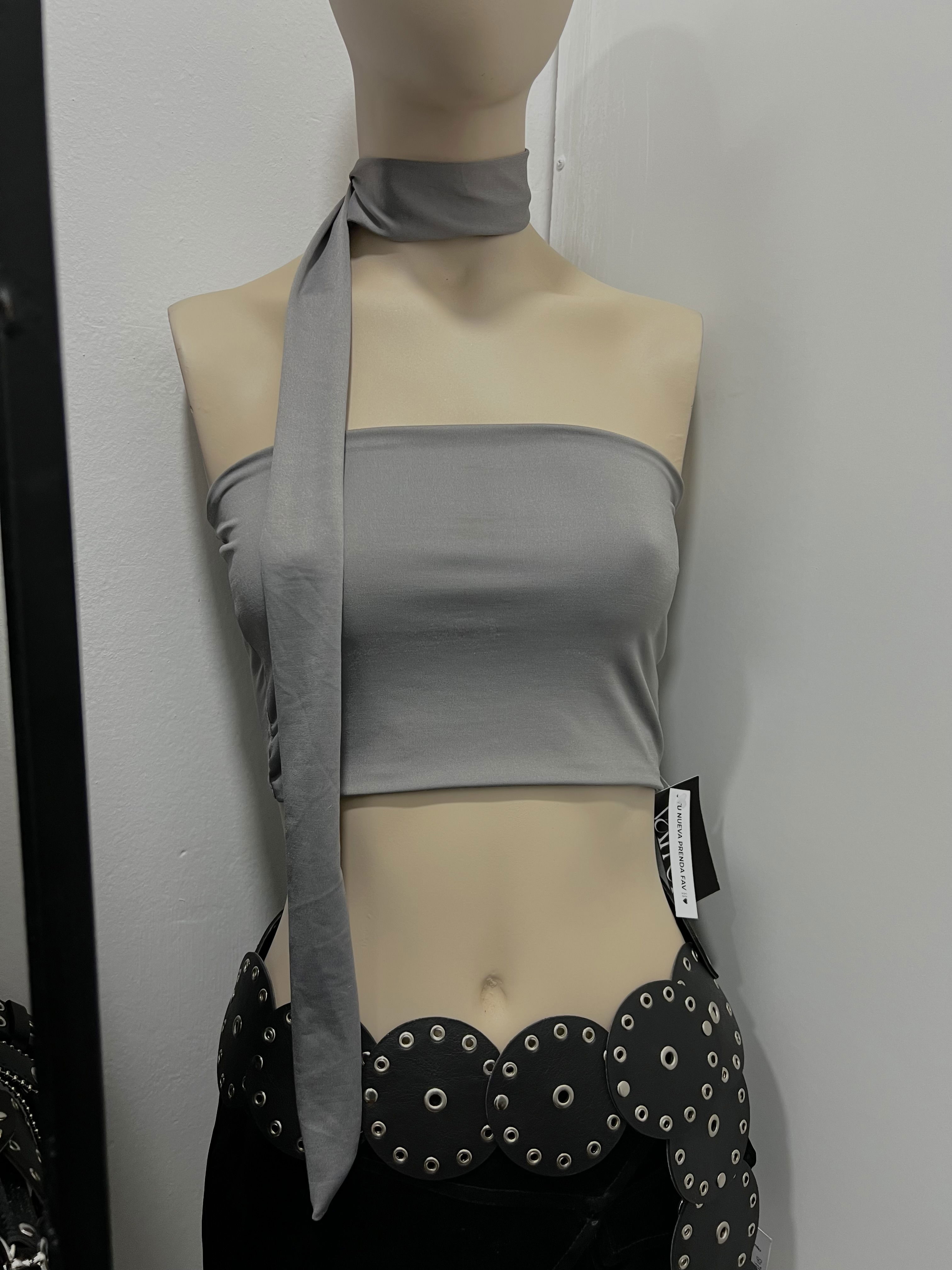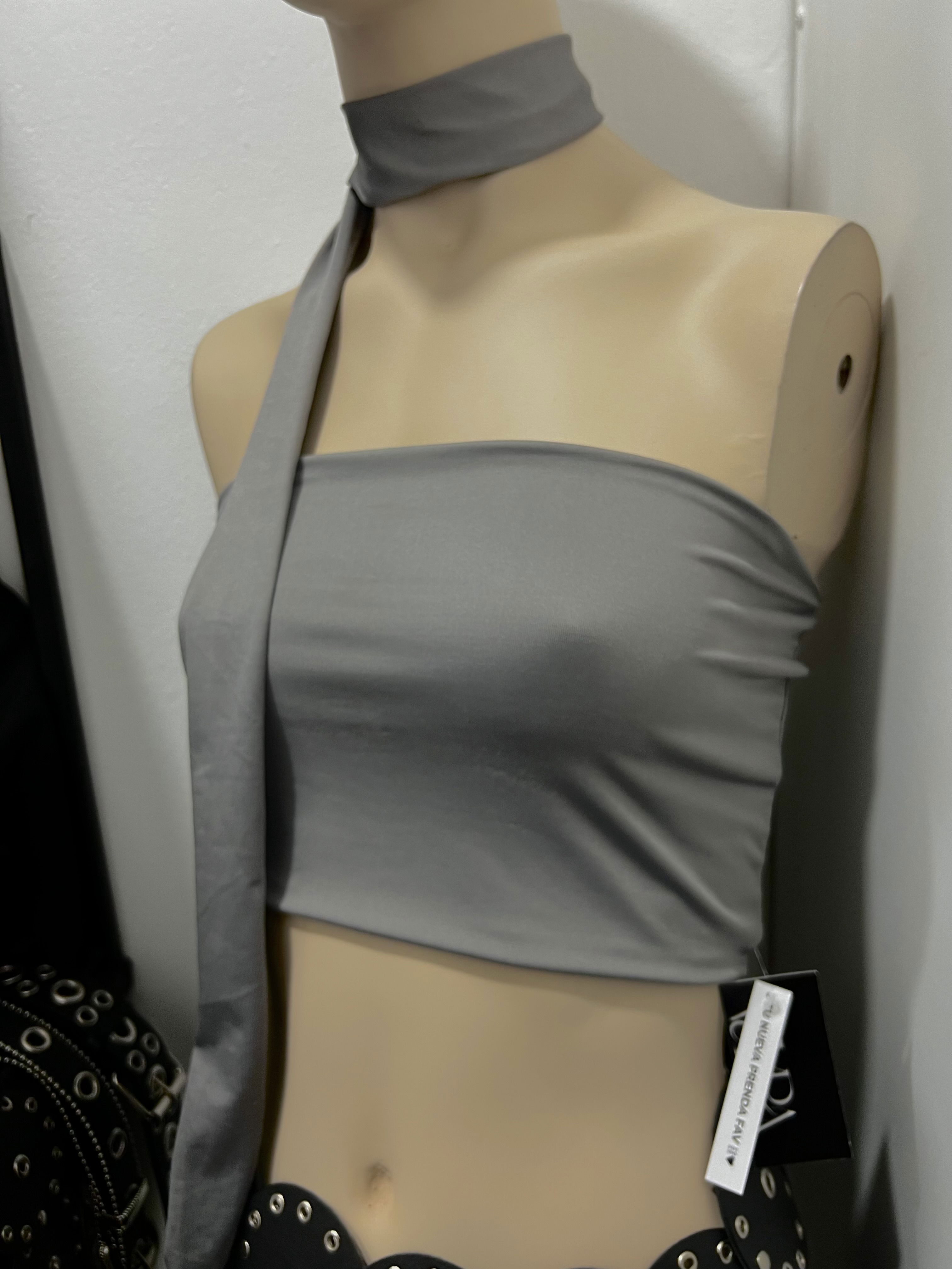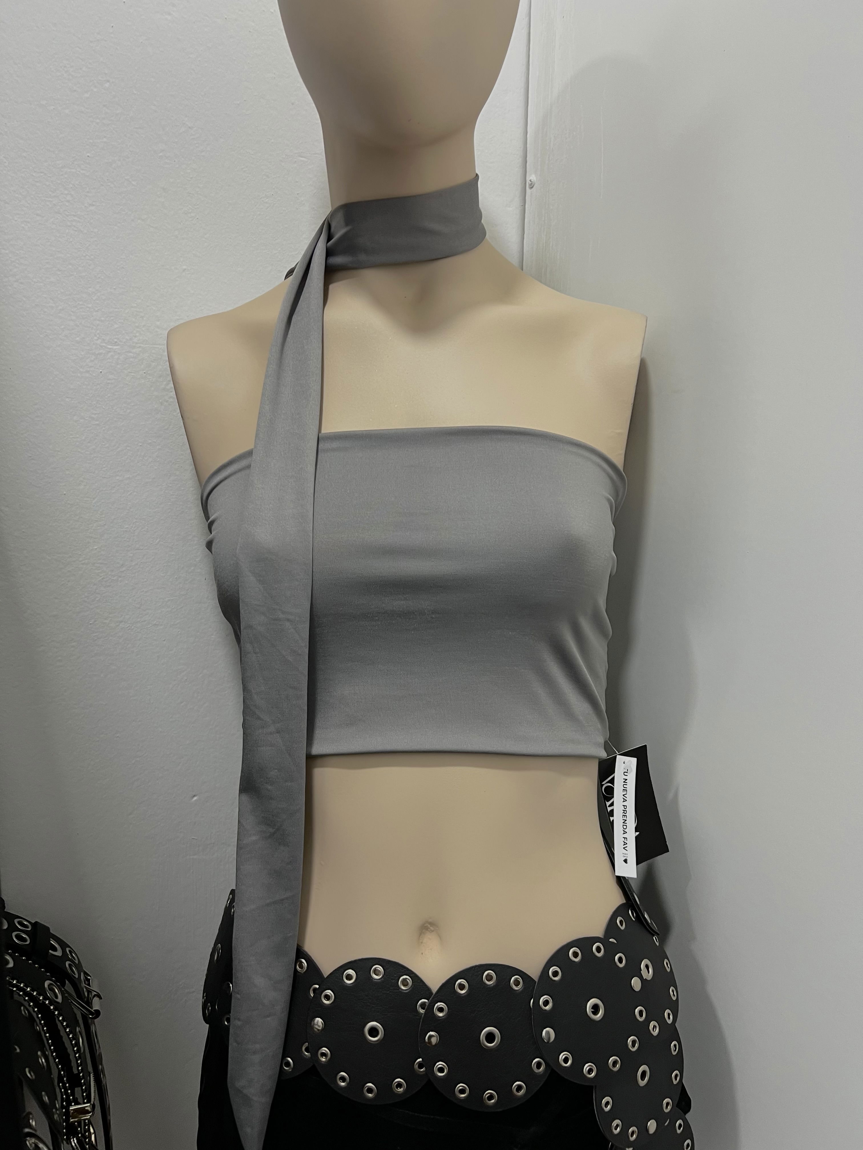 Top strapless gris con corbatín para cruzar en el cuello elastizado