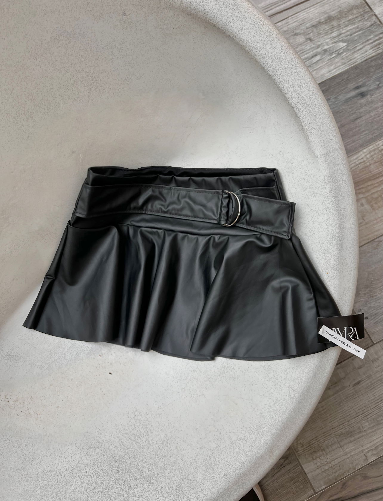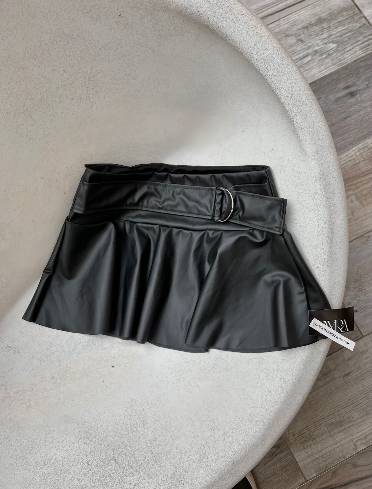 Pollera abierta tiro medio, caida forman pequeños volados corte circular con cinto y hebilla ciercilar en la cintura